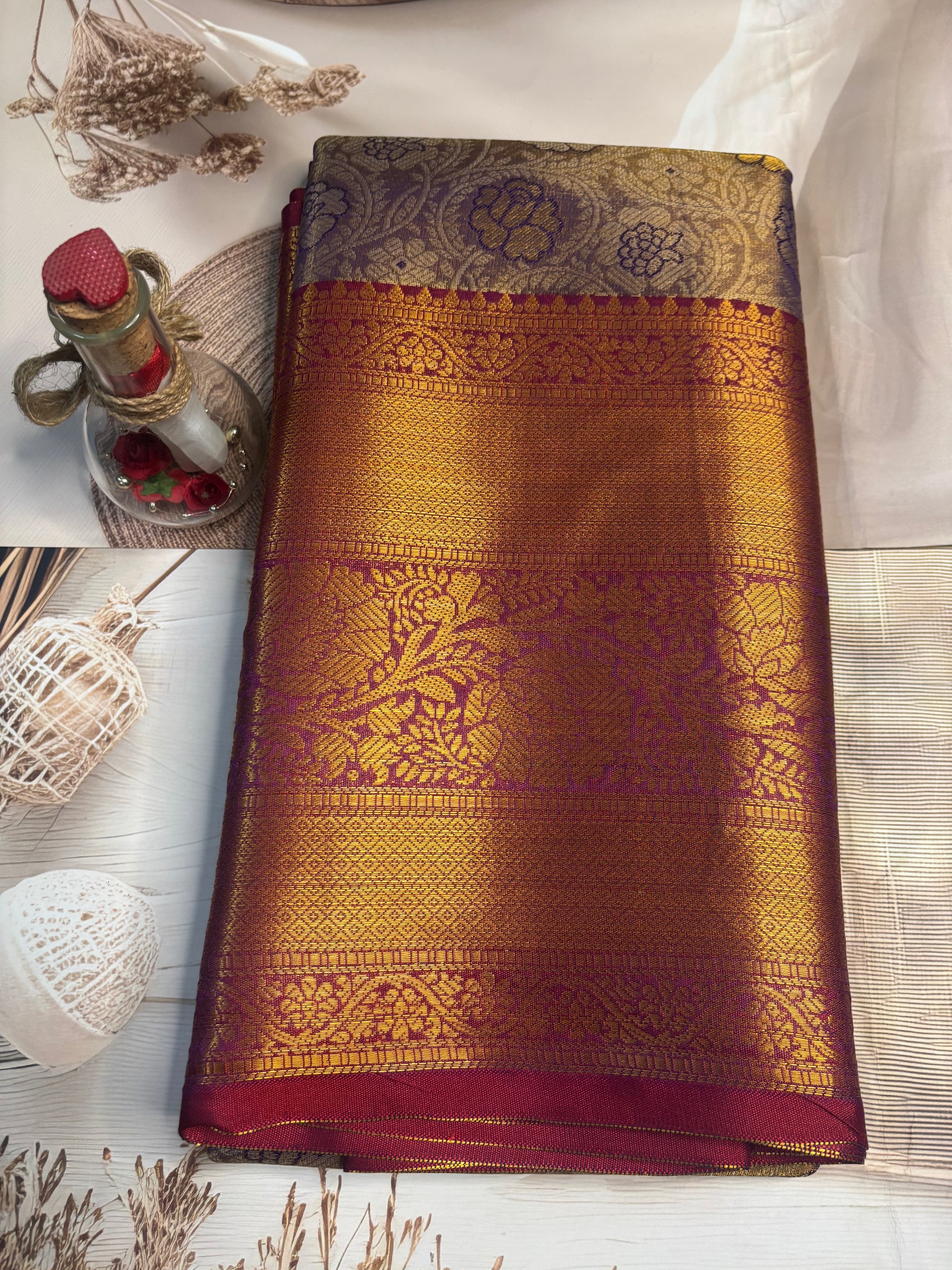 Step into timeless elegance with this exquisite Kanchivaram Semi Silk Saree from Kruthivastra. Designed with a perfect balance of tradition and sophistication, this saree brings you the richness of heritage weaves combined with modern styling. Its lightweight yet premium-quality fabric ensures all-day comfort, while the intricate craftsmanship adds a touch of regal charm. Ideal for weddings, festive occasions, and special celebrations, this saree is a must-have addition to your wardrobe.